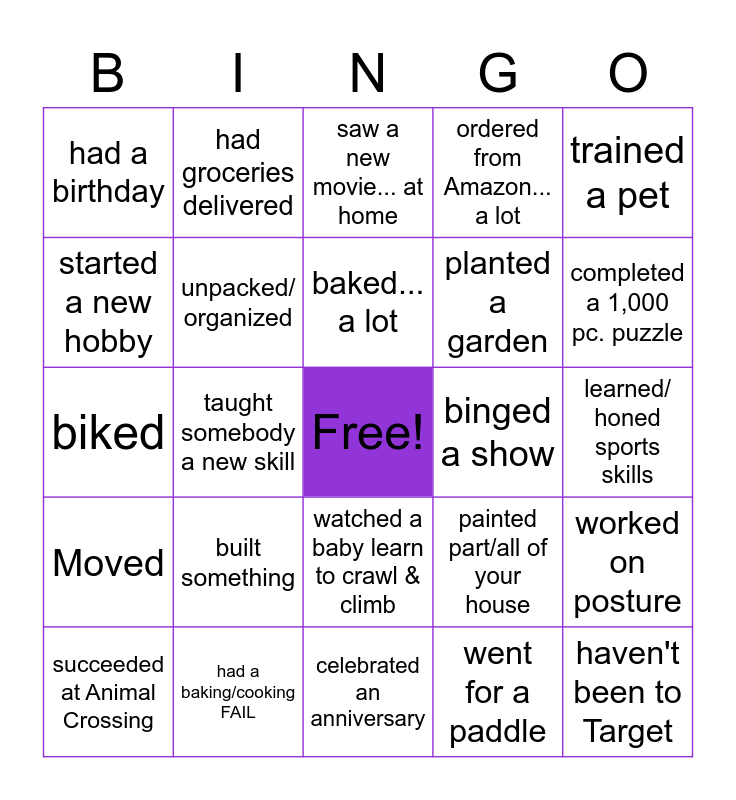 This bingo card has a free space and 24 words: built something, had a baking/cooking FAIL, baked... a lot, succeeded at Animal Crossing, trained a pet, had a birthday, started a new hobby, had groceries delivered, binged a show, watched a baby learn to crawl & climb, planted a garden, biked, painted part/all of your house, worked on posture, unpacked/ organized, went for a paddle, learned/ honed sports skills, saw a new movie... at home, completed a 1,000 pc. puzzle, taught somebody a new skill, haven't been to Target, Moved, ordered from Amazon... a lot and celebrated an anniversary.