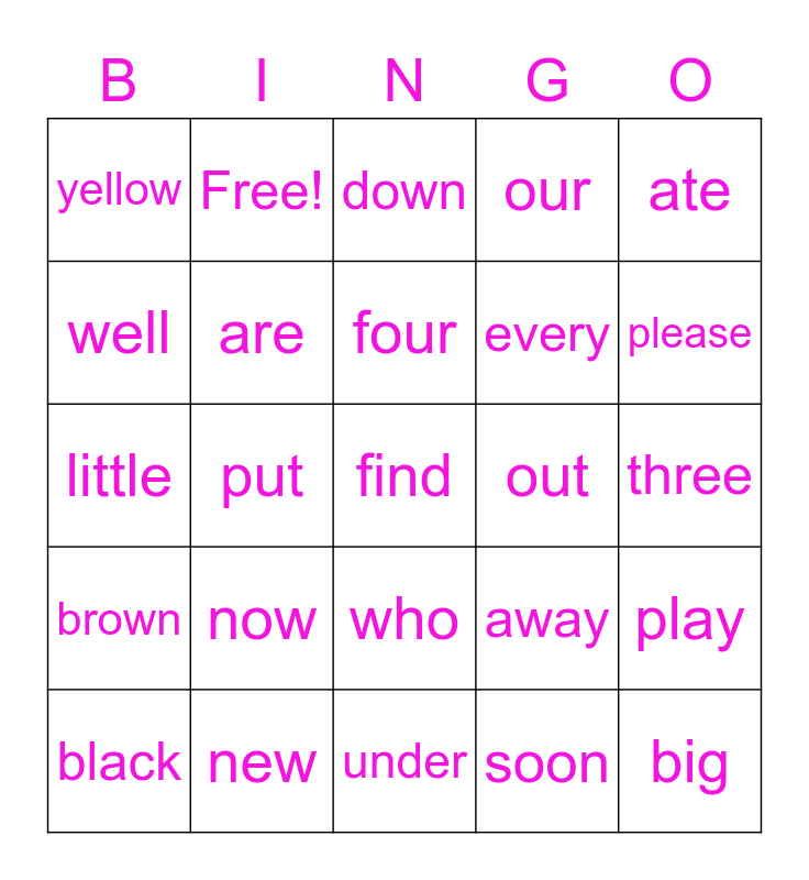 This bingo card has a free space and 34 words: ride, soon, must, funny, brown, are, ate, black, Free!, like, four, down, say, pretty, out, please, new, little, now, away, who, white, yellow, three, under, big, our, once, every, well, jump, put, play and run.