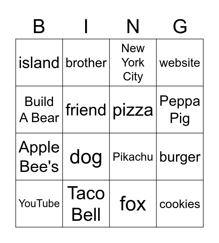 This bingo card has 16 words: Taco Bell, burger, New York City, island, Apple Bee's, brother, Pikachu, fox, Build A Bear, friend, YouTube, website, dog, Peppa Pig, pizza and cookies.