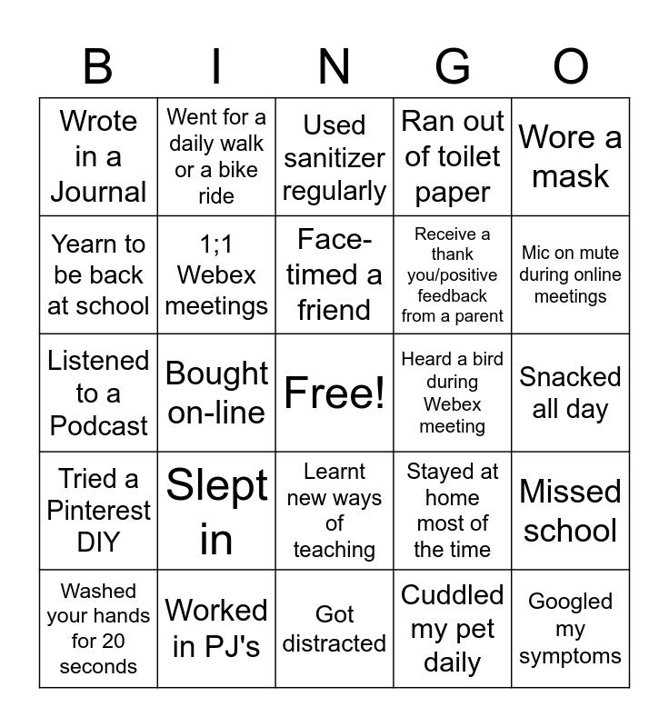 This bingo card has a free space and 24 words: Slept in, Worked in PJ's, Face-timed a friend, Washed your hands for 20 seconds, Wore a mask, Wrote in a Journal, Yearn to be back at school, Went for a daily walk or a bike ride, Heard a bird during Webex meeting, Learnt new ways of teaching, Receive a thank you/positive feedback from a parent, Listened to a Podcast, Stayed at home most of the time, Missed school, 1;1 Webex meetings, Cuddled my pet daily, Snacked all day, Used sanitizer regularly, Mic on mute during online meetings, Bought on-line, Googled my symptoms, Tried a Pinterest DIY, Ran out of toilet paper and Got distracted.