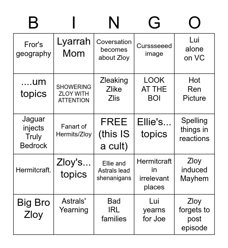 This bingo card has a free space and 24 words: Zloy's... topics, Astrals' Yearning, Zleaking Zlike Zlis, Big Bro Zloy, Lui alone on VC, Fror's geography, ....um topics, Lyarrah Mom, Ellie's... topics, Ellie and Astrals lead shenanigans, LOOK AT THE BOI, Jaguar injects Truly Bedrock, Hermitcraft in irrelevant places, Zloy induced Mayhem, SHOWERING ZLOY WITH ATTENTION, Lui yearns for Joe, Spelling things in reactions, Coversation becomes about Zloy, Hot Ren Picture, Fanart of Hermits/Zloy, Zloy forgets to post episode, Hermitcraft., Curssseeed image and Bad IRL families.