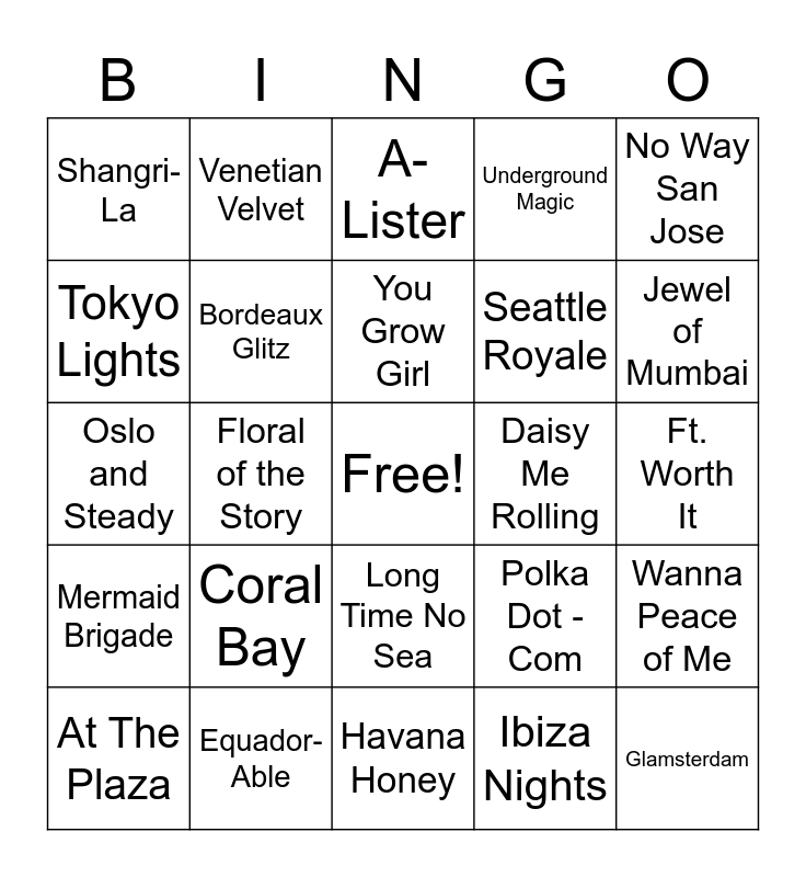 This bingo card has a free space and 29 words: At The Plaza, Jigs Up, Floral of the Story, Portu-gal, Shangri-La, A-Lister, Bordeaux Glitz, Coral Bay, Daisy Me Rolling, Equador-Able, Ft. Worth It, Glamsterdam, Havana Honey, Ibiza Nights, Jewel of Mumbai, Kiss and Toile, Long Time No Sea, Mermaid Brigade, No Way San Jose, Oslo and Steady, Polka Dot - Com, Rule of Plum, Seattle Royale, Tokyo Lights, Underground Magic, Venetian Velvet, Wanna Peace of Me, You Grow Girl and Zebra On The Spot.