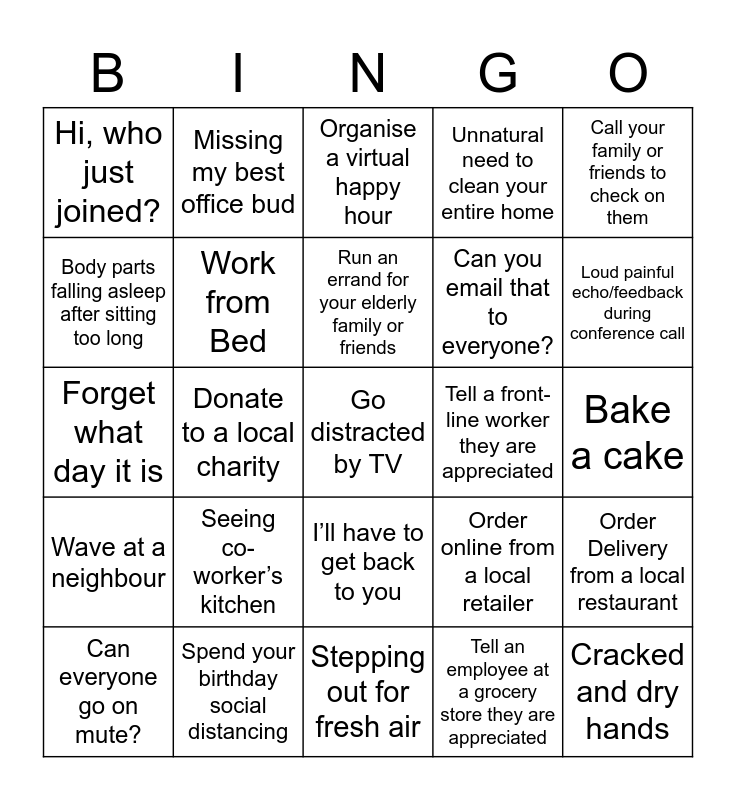 This bingo card has 47 words: Snuggled with my pet, Go distracted by TV, Put in a load of laundry, Stepping out for fresh air, Seeing co-worker’s kitchen, Having a fridge so close is tempting, Missing my best office bud, Too much “Me” time, Body parts falling asleep after sitting too long, Eat breakfast for lunch, Work from Bed, Unnatural need to clean your entire home, Order Delivery from a local restaurant, Order online from a local retailer, Thank a healthcare professional, Thank a delivery person, Run an errand for your elderly family or friends, Tell a front-line worker they are appreciated, Participate in a virtual fitness class of yoga session, Call your family or friends to check on them, Donate to a local charity, Tell an employee at a grocery store they are appreciated, Hi, who just joined?, Can you email that to everyone?, Hi guys, I have to jump on another call, Loud painful echo/feedback during conference call, Can everyone go on mute?, Can we take this offline?, I’ll have to get back to you, Wave at a neighbour, The kids say “I’m bored”, An event you had tickets to get cancelled, Run out of toilet paper, 14-day quarantine after a trip, Found a bottle of hand sanitizer, Spend your birthday social distancing, Bake a cake, Binge 3 or more shows on Netflix, Try a recipe you found on Facebook, Cancel a vacation, Cracked and dry hands, Organise a virtual happy hour, Forget what day it is, Emergency call to IT, Check symptoms for Covid-19, I can’t hear when everyone is talking at the same time and Secretly LOVE social distancing.