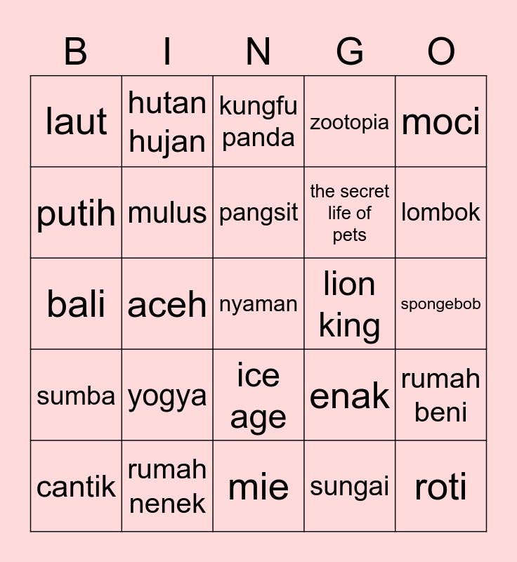 This bingo card has a free space and 24 words: yogya, rumah nenek, pangsit, cantik, moci, laut, putih, hutan hujan, lion king, ice age, the secret life of pets, bali, enak, rumah beni, mulus, sungai, spongebob, kungfu panda, lombok, aceh, roti, sumba, zootopia and mie.