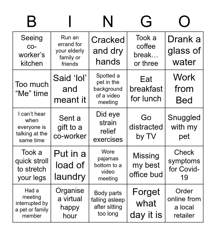 This bingo card has 39 words: Saw a co-worker in person, ‘Can you hear me?’, Joked about how long your “commute” is, Said ‘lol’ and meant it, Had a meeting interrupted by a pet or family member, Wore pajamas bottom to a video meeting, Spotted a pet in the background of a video meeting, Did household chores on your lunch break, Drank a glass of water, Took a quick stroll to stretch your legs, Sent a gift to a co-worker, Took a coffee break… or three, Did eye strain relief exercises, Snuggled with my pet, Go distracted by TV, Put in a load of laundry, Stepping out for fresh air, Seeing co-worker’s kitchen, Having a fridge so close is tempting, Missing my best office bud, Too much “Me” time, Body parts falling asleep after sitting too long, Eat breakfast for lunch, Work from Bed, Unnatural need to clean your entire home, Order Delivery from a local restaurant, Order online from a local retailer, Thank a healthcare professional, Thank a delivery person, Run an errand for your elderly family or friends, Try a recipe you found on Facebook, Cancel a vacation, Cracked and dry hands, Organise a virtual happy hour, Forget what day it is, Emergency call to IT, Check symptoms for Covid-19, I can’t hear when everyone is talking at the same time and Secretly LOVE social distancing.