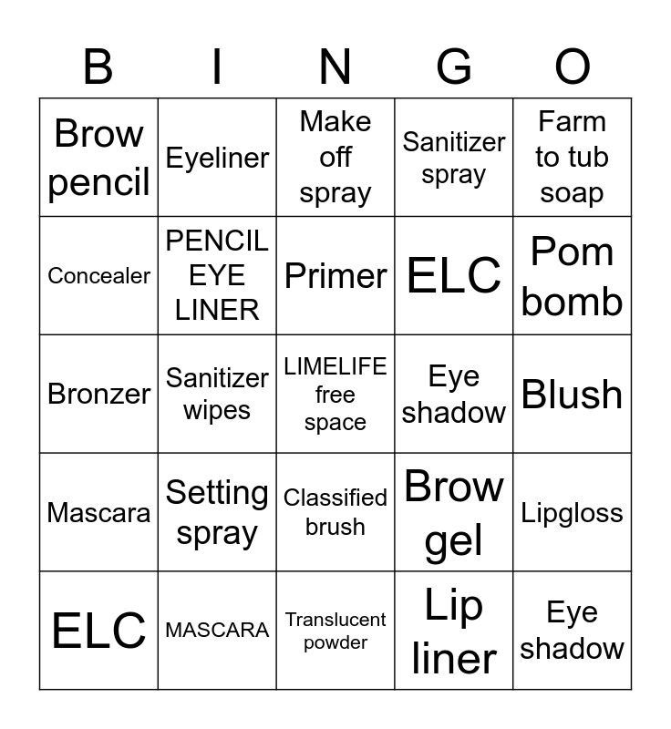 This bingo card has a free space and 24 words: Setting spray, MASCARA, Primer, ELC, Farm to tub soap, Brow pencil, Concealer, Eyeliner, Eye shadow, Classified brush, ELC, Bronzer, Brow gel, Lipgloss, PENCIL EYE LINER, Lip liner, Blush, Make off spray, Pom bomb, Sanitizer wipes, Eye shadow, Mascara, Sanitizer spray and Translucent powder.
