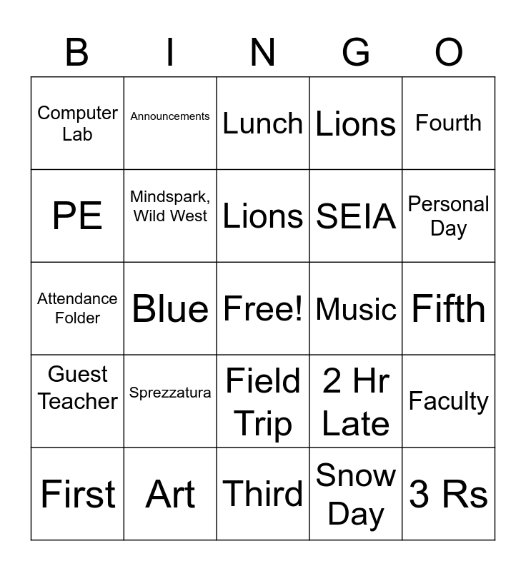 This bingo card has a free space and 24 words: Sprezzatura, Art, Lions, First, Fourth, Computer Lab, PE, Announcements, Music, Field Trip, SEIA, Attendance Folder, 2 Hr Late, Faculty, Mindspark, Wild West, Snow Day, Fifth, Lunch, Personal Day, Blue, 3 Rs, Guest Teacher, Lions and Third.
