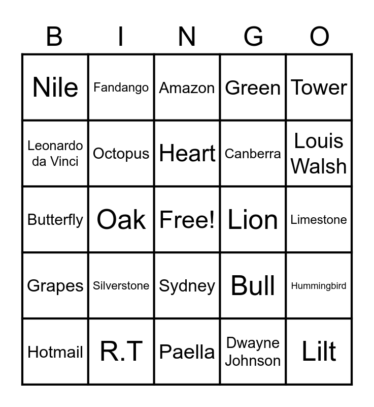 This bingo card has a free space and 70 words: Ice, Limestone, Basalt, Ariel, R.T, U.K, Green, Red, Tower, Nest, Hummingbird, Owl, Nile, Amazon, Pine, Oak, Sydney, Canberra, Pineapple, Grapes, Lion, Bull, Louis Walsh, Simon Cowell, 1980s, 1990s, Beyonce and Jay Z, KIm Kardashian West and Kayne West, Dwayne Johnson, Newcastle, Fandango, Pasodoble, Canadian, American, Irn-Bru, New York, Hawaii, Olaf, think legion, Leonardo da Vinci, D’oh!, Silverstone, Lilt, New Zealand Dollar, Japanese Yen, Octopus, Hotmail, All Clear, Earthquake, Oysters, Marie Curie, Brazil, China, Vodka, Paella, Italy, Heart, Calcium, Skin, Spice Girls, Butterfly, Doe, Stick together, Guitar, Siesta, Shakespeare, Sleeping Beauty, Water, Dublin and Bonsai.