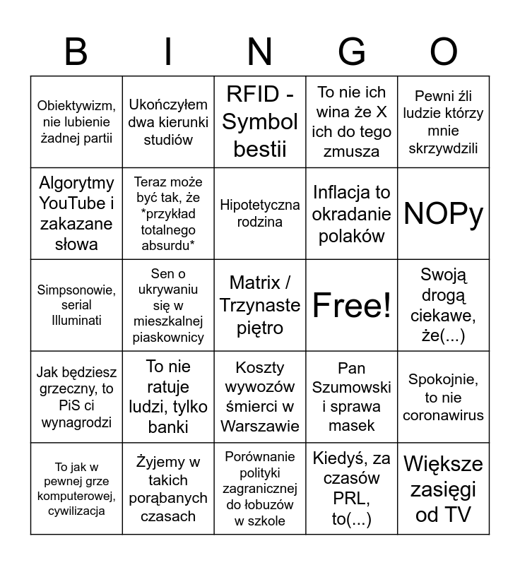 This bingo card has a free space and 24 words: To nie ratuje ludzi, tylko banki, Żyjemy w takich porąbanych czasach, Hipotetyczna rodzina, To jak w pewnej grze komputerowej, cywilizacja, Pewni źli ludzie którzy mnie skrzywdzili, Obiektywizm, nie lubienie żadnej partii, Algorytmy YouTube i zakazane słowa, Ukończyłem dwa kierunki studiów, Free!, Koszty wywozów śmierci w Warszawie, Inflacja to okradanie polaków, Simpsonowie, serial Illuminati, Pan Szumowski i sprawa masek, Spokojnie, to nie coronawirus, Teraz może być tak, że *przykład totalnego absurdu*, Kiedyś, za czasów PRL, to(...), Swoją drogą ciekawe, że(...), RFID - Symbol bestii, NOPy, Sen o ukrywaniu się w mieszkalnej piaskownicy, Większe zasięgi od TV, Jak będziesz grzeczny, to PiS ci wynagrodzi, To nie ich wina że X ich do tego zmusza and Porównanie polityki zagranicznej do łobuzów w szkole.