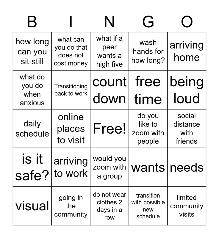 This bingo card has a free space and 24 words: arriving to work, going in the community, count down, visual, arriving home, how long can you sit still, what do you do when anxious, what can you do that does not cost money, do you like to zoom with people, would you zoom with a group, free time, daily schedule, wants, needs, Transitioning back to work, transition with possible new schedule, social distance with friends, what if a peer wants a high five, being loud, online places to visit, limited community visits, is it safe?, wash hands for how long? and do not wear clothes 2 days in a row.