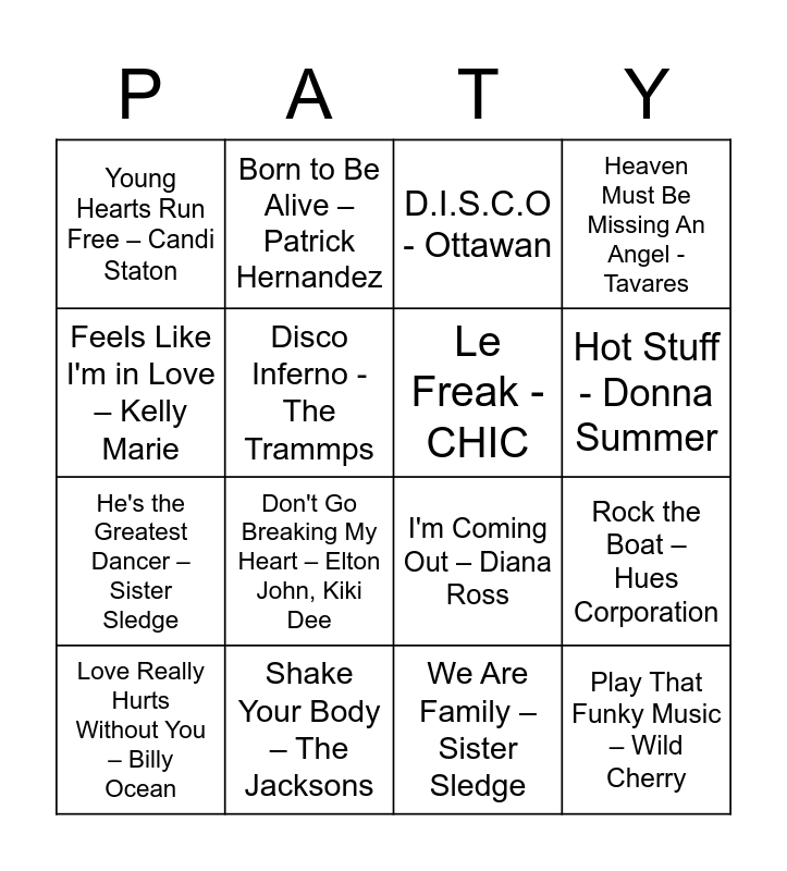 This bingo card has 45 words: Rock Your Baby – George McCrae, Love Really Hurts Without You – Billy Ocean, Never Can Say Goodbye - Gloria Gaynor, Jump (For My Love) – The Pointer Sisters, Car Wash – Rose Royce, Da Ya Think I'm Sexy? – Rod Stewart, D.I.S.C.O - Ottawan, In the Navy - Village People, Feels Like I'm in Love – Kelly Marie, Love Train – The O'Jays, Heaven Must Be Missing An Angel - Tavares, Shake Your Body – The Jacksons, Give It Up – KC & The Sunshine Band, I'm So Excited – The Pointer Sisters, Ring My Bell – Anita Ward, Last Night a D.J. Saved My Life – Indeep, I'm Every Woman – Chaka Khan, I'm Coming Out – Diana Ross, Celebration - Kool & The Gang, Don't Go Breaking My Heart – Elton John, Kiki Dee, Born to Be Alive – Patrick Hernandez, Yes Sir, I Can Boogie – Baccara, Superstition - Stevie Wonder, Young Hearts Run Free – Candi Staton, Super Freak – Rick James, We Are Family – Sister Sledge, A Horse with No Name – America, Upside Down – Diana Ross, You Make Me Feel (Mighty Real) – Sylvester, Play That Funky Music – Wild Cherry, Let's Groove – Earth, Wind & Fire, Best of My Love – The Emotions, You Should Be Dancing – Bee Gees, Don't Stop 'Til You Get Enough - Michael Jackson, You Sexy Thing – Hot Chocolate, Rock the Boat – Hues Corporation, Daddy Cool – Boney M., Blame It on the Boogie – The Jacksons, Dancing Queen – ABBA, Hot Stuff - Donna Summer, Disco Inferno - The Trammps, He's the Greatest Dancer – Sister Sledge, Boogie Wonderland – Earth, Wind & Fire, Le Freak - CHIC and Instant Replay - Dan Hartman.