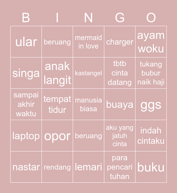 This bingo card has a free space and 24 words: opor, rendang, kastangel, nastar, ayam woku, ular, singa, beruang, buaya, beruang, tbtb cinta datang, sampai akhir waktu, aku yang jatuh cinta, indah cintaku, anak langit, para pencari tuhan, ggs, mermaid in love, tukang bubur naik haji, tempat tidur, buku, laptop, charger and lemari.