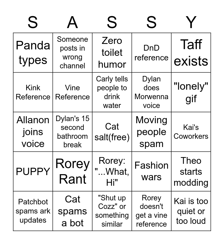 This bingo card has a free space and 24 words: Rorey Rant, Cat spams a bot, Carly tells people to drink water, Patchbot spams ark updates, Taff exists, Panda types, Kink Reference, Someone posts in wrong channel, Moving people spam, Rorey: "...What, Hi", Dylan does Morwenna voice, Allanon joins voice, Fashion wars, Theo starts modding, Vine Reference, Rorey doesn't get a vine reference, Kai's Coworkers, Zero toilet humor, "lonely" gif, Dylan's 15 second bathroom break, Kai is too quiet or too loud, PUPPY, DnD reference and "Shut up Cozz" or something similar.