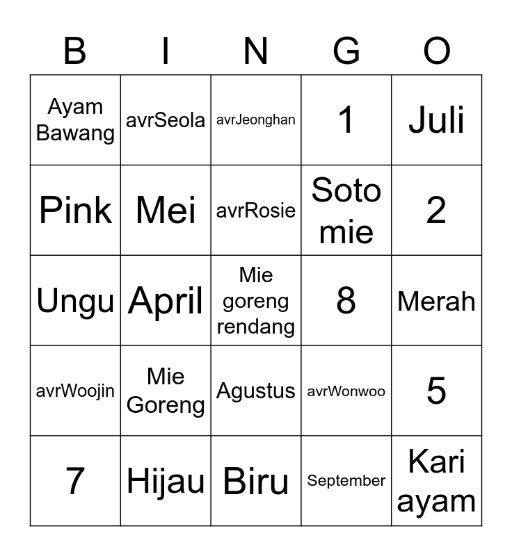 This bingo card has 25 words: Mie Goreng, Biru, avrRosie, 7, Juli, Ayam Bawang, Pink, avrSeola, 8, Agustus, Soto mie, Ungu, avrWonwoo, 5, Mei, Kari ayam, Merah, avrJeonghan, 2, April, Mie goreng rendang, Hijau, avrWoojin, 1 and September.