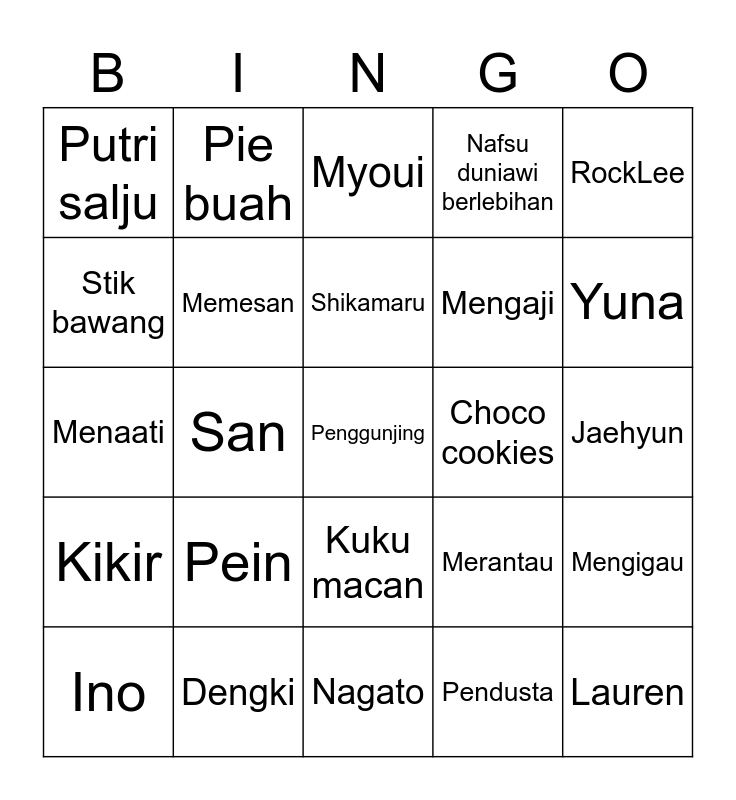 This bingo card has 25 words: Pein, Nagato, Shikamaru, Ino, RockLee, Putri salju, Stik bawang, Pie buah, Choco cookies, Kuku macan, Mengaji, Menaati, Merantau, Mengigau, Memesan, Lauren, Jaehyun, Myoui, Yuna, San, Penggunjing, Dengki, Kikir, Nafsu duniawi berlebihan and Pendusta.