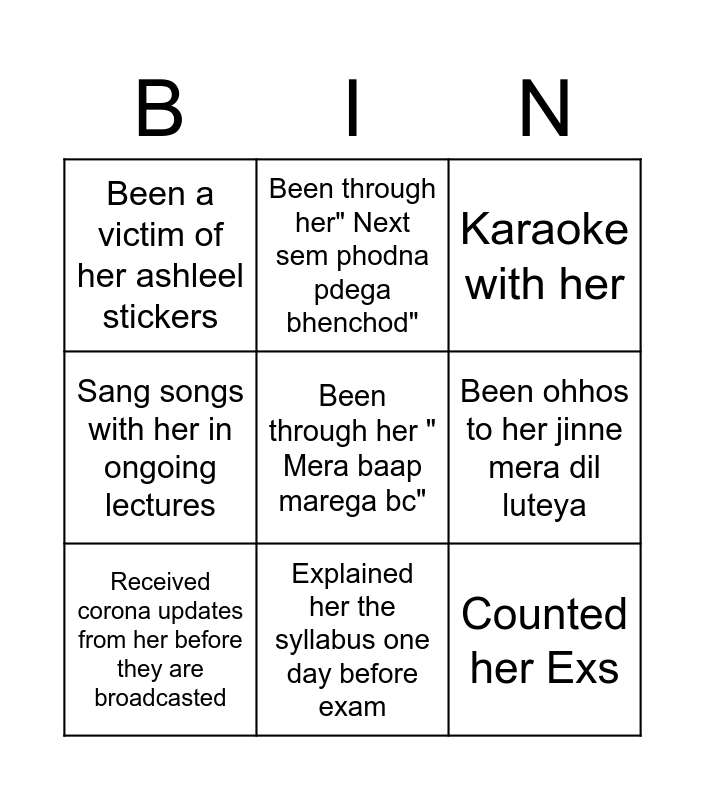 This bingo card has a free space and 8 words: Been ohhos to her jinne mera dil luteya, Karaoke with her, Been through her" Next sem phodna pdega bhenchod", Received corona updates from her before they are broadcasted, Been a victim of her ashleel stickers, Counted her Exs, Sang songs with her in ongoing lectures and Explained her the syllabus one day before exam.