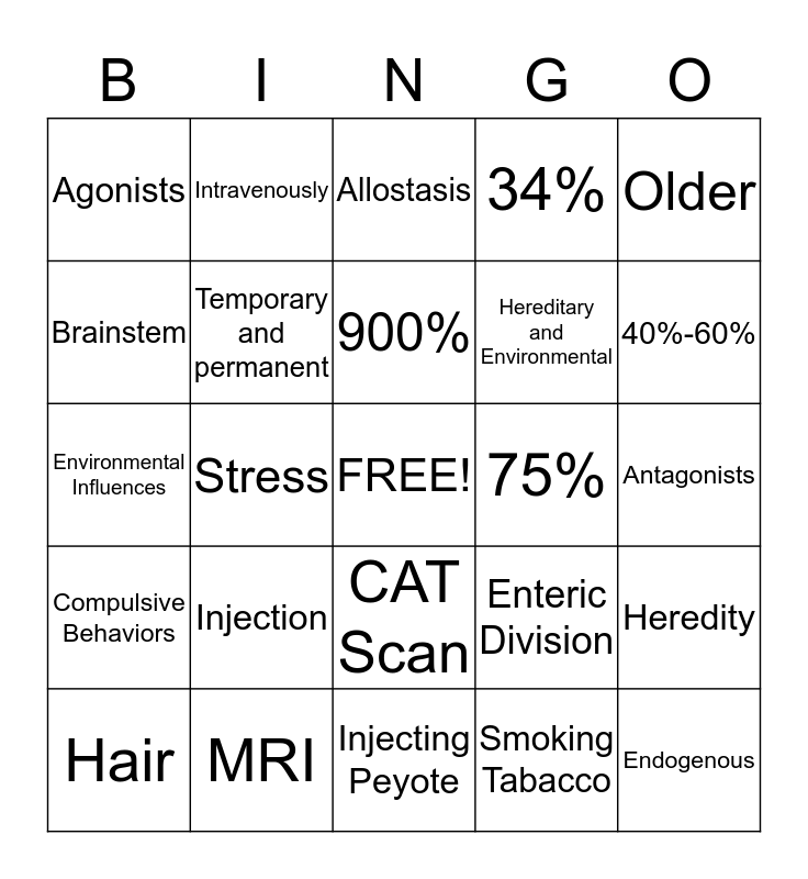 This bingo card has a free space and 24 words: Injection, MRI, 900%, Hair, Older, Agonists, Brainstem, Intravenously, 75%, CAT Scan, Hereditary and Environmental, Environmental Influences, Enteric Division, Heredity, Temporary and permanent, Smoking Tabacco, Antagonists, Allostasis, 40%-60%, Stress, Endogenous, Compulsive Behaviors, 34% and Injecting Peyote.