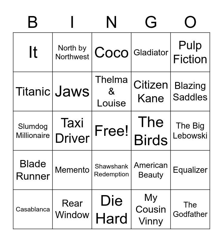 This bingo card has a free space and 82 words: Lady Bird, Dunkirk, Coco, The Post, Dead Ringers, American Psycho, Rush Hour, Ben Hur, Magic Mike, Runaway Jury, Blue Lagoon, Rudy, Jaws, The Birds, The Exorcist, It, Casablanca, Titanic, Dirty Dancing, Chasing Amy, Happy Gilmore, Citizen Kane, The Godfather, Pulp Fiction, Taxi Driver, Reservoir Dogs, Airplane!, Pan's Labyrinth, Doctor Zhivago, Up, Memento, Braveheart, Slumdog Millionaire, Seven, Inception, Die Hard, Amadeus, Wall-E, Blazing Saddles, Almost Famous, Vertigo, Gladiator, Avatar, Raging Bull, Groundhog Day, North by Northwest, Amelie, Thelma & Louise, Sunset Blvd., The Dark Knight, Good Will Hunting, The Big Lebowski, Rear Window, The Usual Suspects, Saving Private Ryan, The Matrix, Fight Club, The Shining, A Clockwork Orange, American Beauty, Fargo, The Princess Bride, Blade Runner, Goodfellas, Forrest Gump, Star Wars, Schindler's List, Top Gun, 8 Mile, Training Day, Casino Royale, Hustle & Flow, Shawshank Redemption, My Cousin Vinny, Catch Me if you Can, Cool Runnings, Armageddon, Sound of Music, The Sixth Sense, Napolean Dynamite, Equalizer and Traffic.
