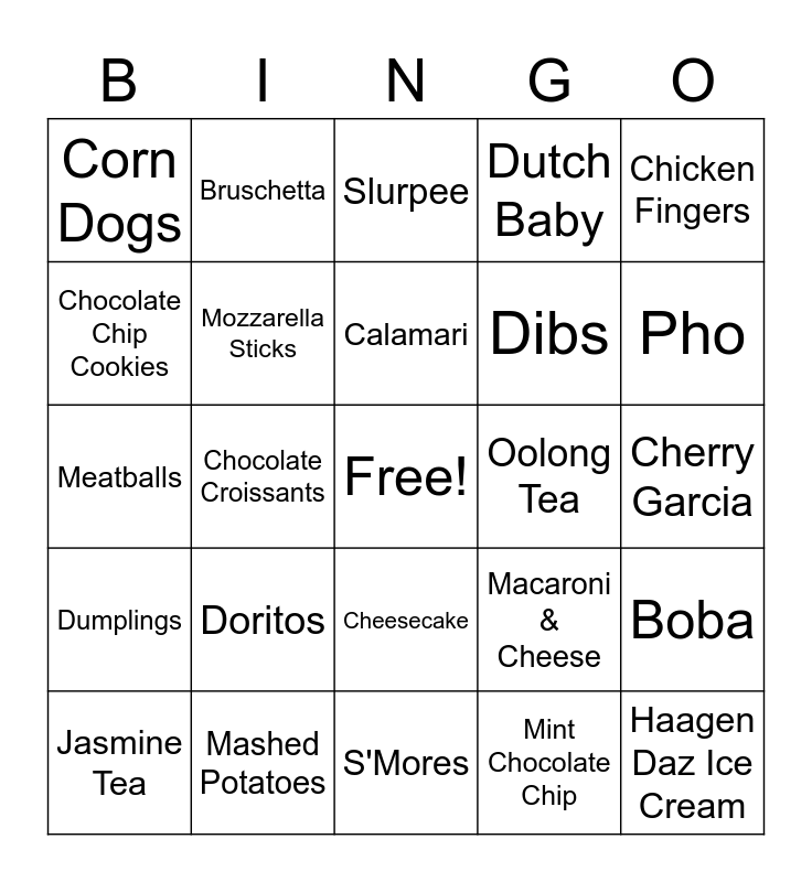 This bingo card has a free space and 66 words: Alfredo Noodles, Annie's Original Snack Mix, Bacon, Boba, Brick and Wood Pizza, Broccoli Beef, Bruschetta, Caesar Salad, Calamari, California Rolls, Cheesecake, Cheetos, Cherry Garcia, Chicken Fingers, Chimmichuri, Chocolate Chip Cookies, Chocolate Croissants, Corn Dogs, Cupcakes, Dibs, Doritos, Dumplings, Dutch Baby, Egg Drop Soup, Filet Mignon, Firehook Sea Salt Crackers, Flat Iron Steaks, Gummy Worms, Haagen Daz Ice Cream, Hot Dogs, Jasmine Tea, Kalbi Ribs, Lasagna, Lemonade, Macaroni & Cheese, Mashed Potatoes, McDonald's Fries, Meatballs, Mint Chocolate Chip, Miso Soup, Mozzarella Sticks, Omelets, Oolong Tea, Oyster Crackers, Pancakes, Penne Ala Vodka, Pho, Pizza, Pocky, Popcorn, Potato Chips, Ramen, Rice, Salmon, Shake Shack Bucket of Fries, Shake Shack Burgers, Shiki Hana Sushi, Silken Tofu, Slurpee, S'Mores, Spaghetti Bolognese, Spaghetti Pomodoro, Spam Rice, Tacos, Van Leewen Ice Cream and Waffles.