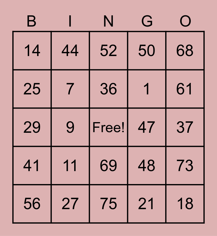 This bingo card has a free space and 24 words: 11, 27, 36, 56, 68, 14, 25, 44, 47, 69, 1, 29, 48, 73, 7, 21, 37, 52, 61, 9, 18, 41, 50 and 75.