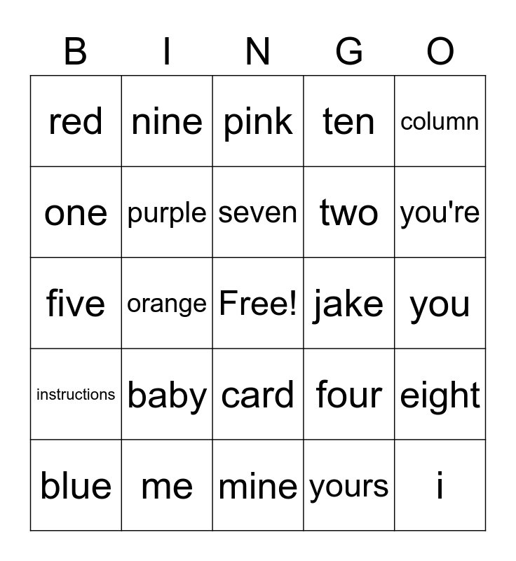 This bingo card has a free space and 29 words: blue, yellow, orange, green, red, pink, purple, baby, jake, me, you, i, mine, yours, you're, bingo, card, instructions, column, five, four, three, two, one, ten, nine, eight, seven and six.