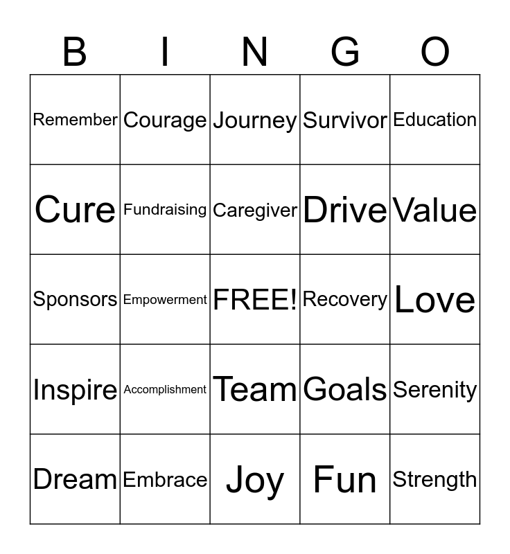 This bingo card has a free space and 35 words: Commitment, Hope, Relay, Fundraising, Team, Survivor, Cure, Activities, Caregiver, Family, Sponsors, Education, Fight Back, Community, Remember, Recovery, Fun, Empowerment, Inspire, Strength, Goals, Dream, Serenity, Embrace, Journey, Value, Determination, Dedication, Drive, Love, Life, Joy, Accomplishment, Courage and Support System.