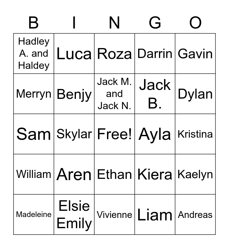 This bingo card has a free space and 24 words: Aren, Elsie Emily, Jack M. and Jack N., Madeleine, Gavin, Hadley A. and Haldey, Merryn, Luca, Ayla, Ethan, Jack B., Sam, Kiera, Kaelyn, Benjy, Liam, Kristina, Roza, Dylan, Skylar, Andreas, William, Darrin and Vivienne.