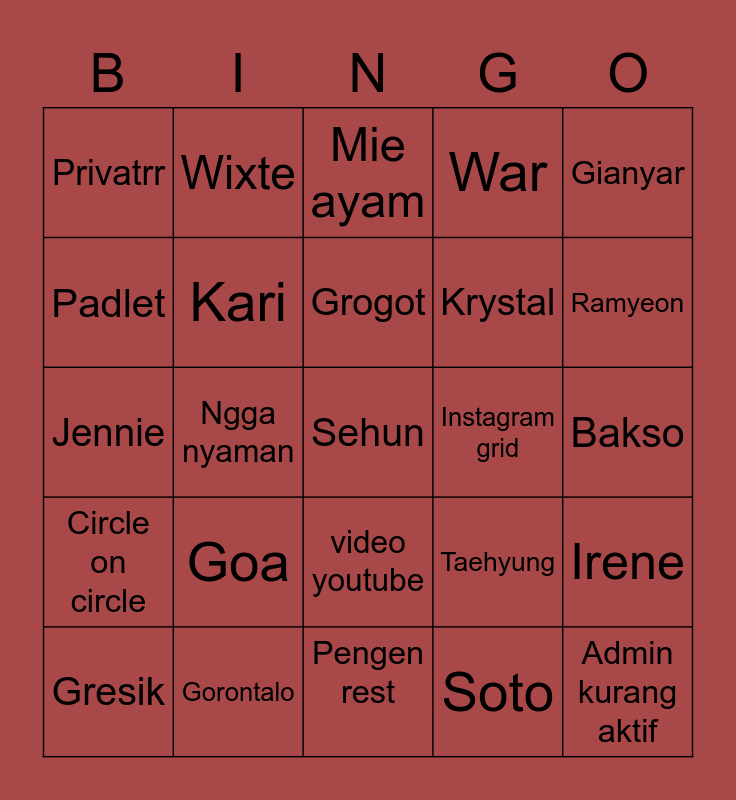 This bingo card has a free space and 24 words: Goa, Gorontalo, Grogot, Gresik, Gianyar, Privatrr, Padlet, Wixte, Instagram grid, video youtube, Krystal, Jennie, Taehyung, Irene, Kari, Soto, Bakso, Mie ayam, Ramyeon, Ngga nyaman, Admin kurang aktif, Circle on circle, War and Pengen rest.