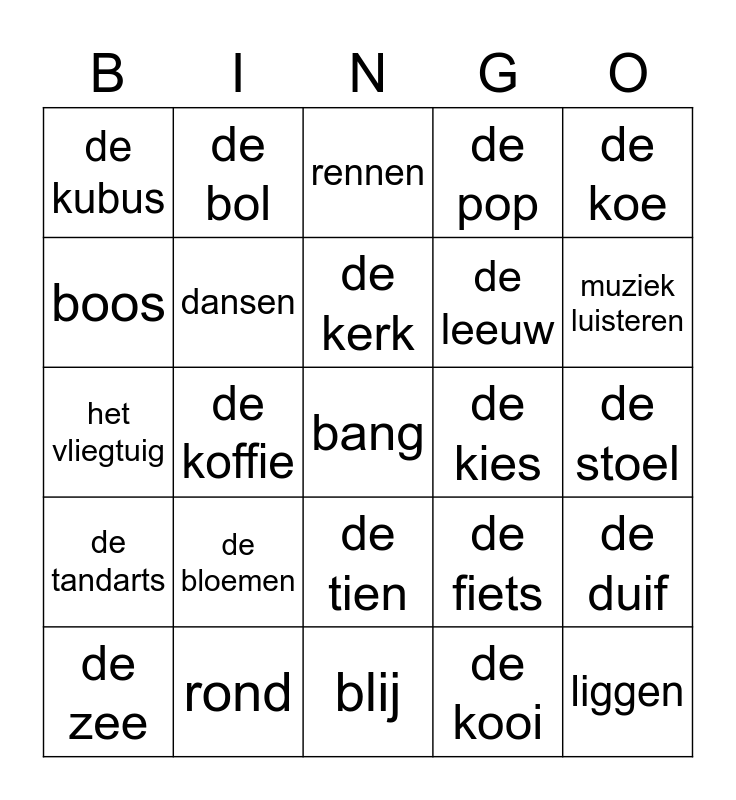 This bingo card has 52 words: de baard, bang, bedroefd / huilen, blij, de bloemen, het boek, de bol, de boom, boos, de computer, dansen, de driehoek, de duif, de fiets, het huis, de jurk, de kerk, de kies, de klok, de koe, de koffie, de kooi, de kubus, de leeuw, lezen, liggen, lopen, de moskee, muziek luisteren, de pan, de piramide, de pop, het potlood, het raam, de rechthoek, rennen, rond, het schilderij, schrijven, slapen, het (stand)beeld, de stoel, de tandarts, de telefoon, de tien, de trein, het vierkant, het vliegtuig, de voet, de vuist, de zee and zitten.