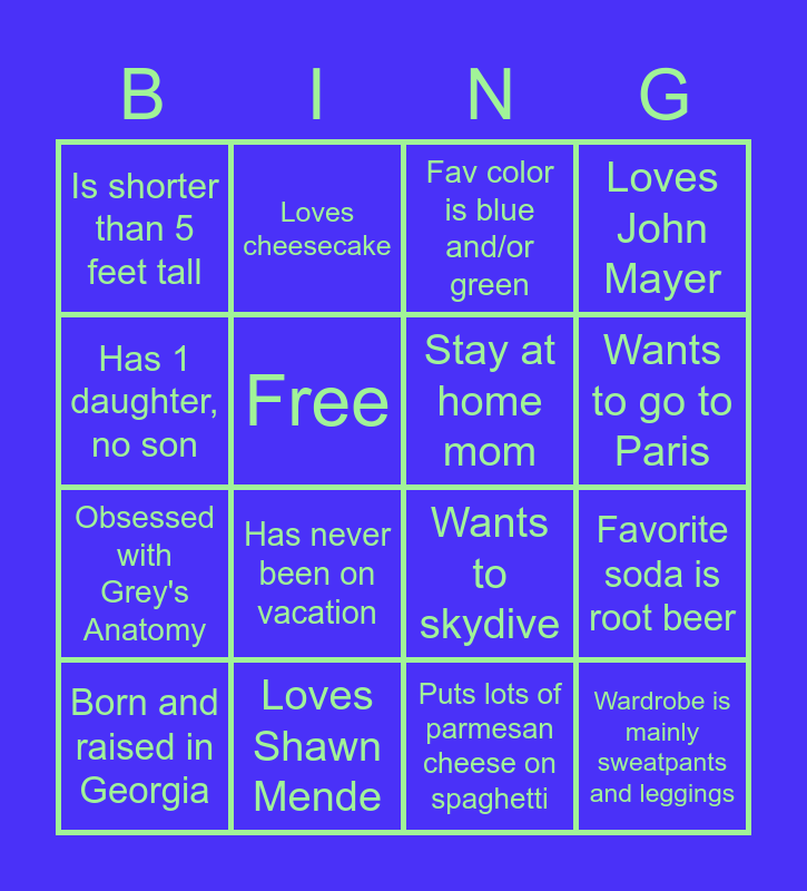 This bingo card has 16 words: Loves Shawn Mende, Favorite soda is root beer, Fav color is blue and/or green, Is shorter than 5 feet tall, Obsessed with Grey's Anatomy, Loves cheesecake, Wants to skydive, Puts lots of parmesan cheese on spaghetti, Has 1 daughter, no son, Free, Born and raised in Georgia, Loves John Mayer, Has never been on vacation, Wants to go to Paris, Stay at home mom and Wardrobe is mainly sweatpants and leggings.
