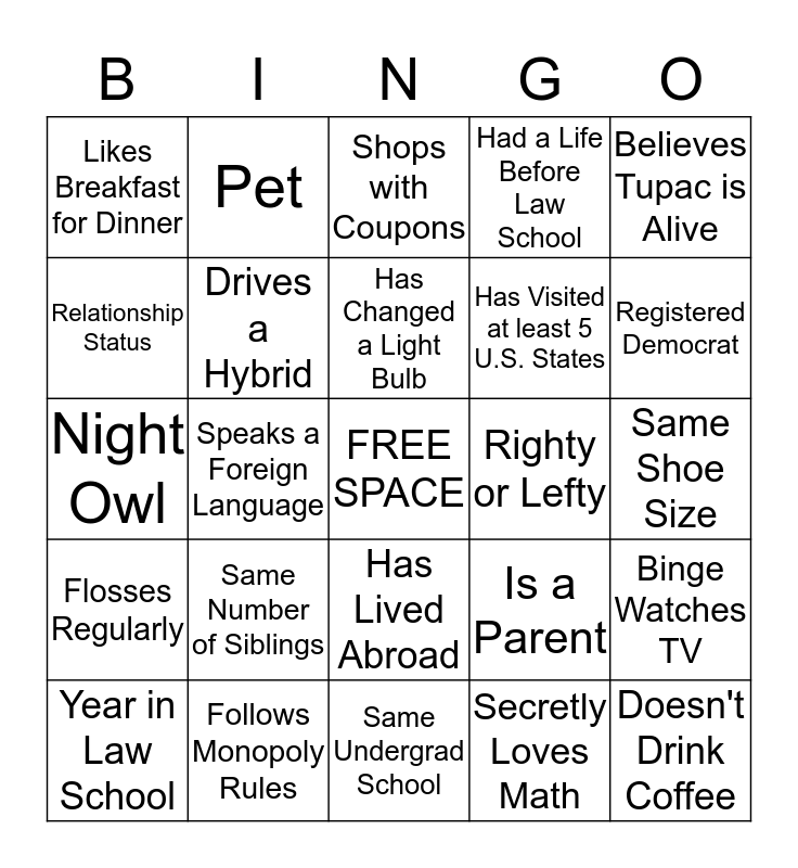 This bingo card has a free space and 24 words: Same Number of Siblings, Follows Monopoly Rules, Has Changed a Light Bulb, Year in Law School, Believes Tupac is Alive, Likes Breakfast for Dinner, Relationship Status, Pet, Righty or Lefty, Has Lived Abroad, Has Visited at least 5 U.S. States, Night Owl, Is a Parent, Binge Watches TV, Drives a Hybrid, Secretly Loves Math, Same Shoe Size, Shops with Coupons, Registered Democrat, Speaks a Foreign Language, Doesn't Drink Coffee, Flosses Regularly, Had a Life Before Law School and Same Undergrad School.