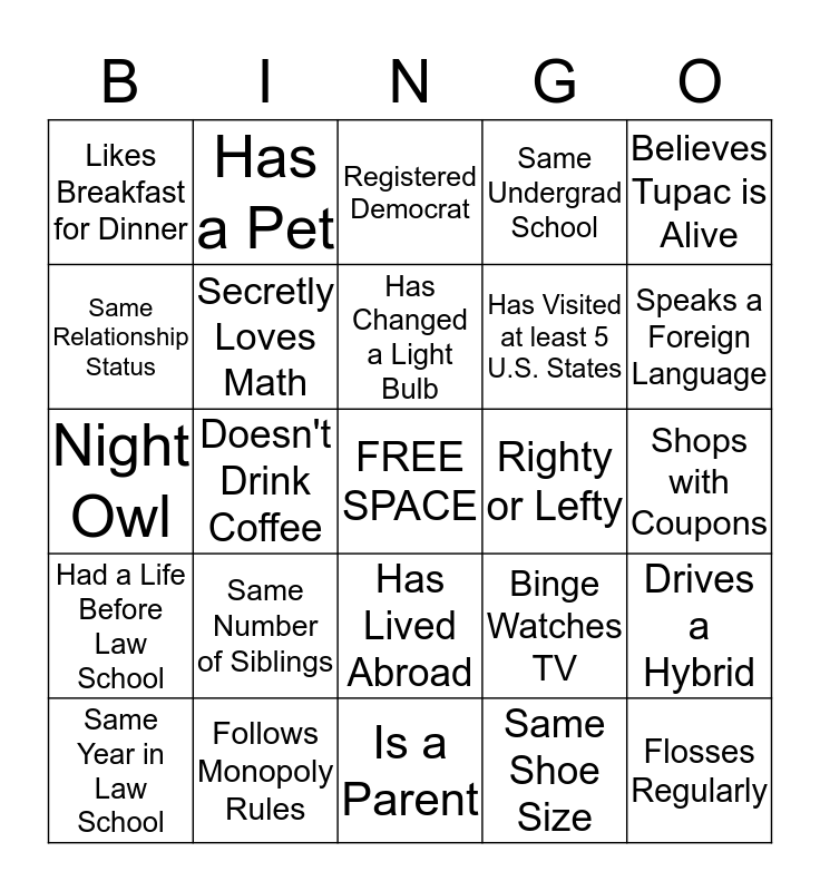 This bingo card has a free space and 24 words: Same Number of Siblings, Follows Monopoly Rules, Has Changed a Light Bulb, Same Year in Law School, Believes Tupac is Alive, Likes Breakfast for Dinner, Same Relationship Status, Has a Pet, Righty or Lefty, Has Lived Abroad, Has Visited at least 5 U.S. States, Night Owl, Binge Watches TV, Drives a Hybrid, Secretly Loves Math, Same Shoe Size, Shops with Coupons, Registered Democrat, Speaks a Foreign Language, Doesn't Drink Coffee, Flosses Regularly, Had a Life Before Law School, Same Undergrad School and Is a Parent.