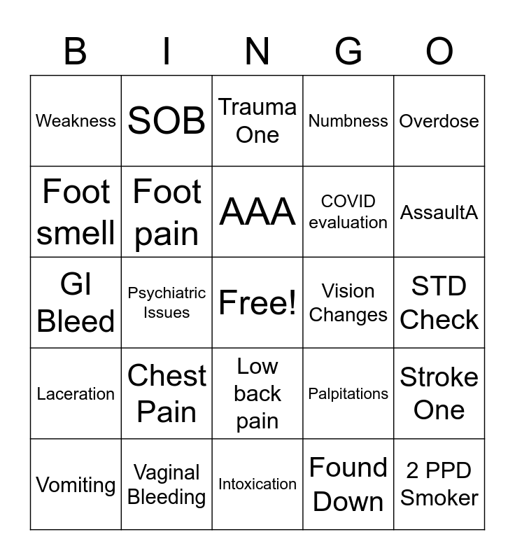 This bingo card has a free space and 24 words: Chest Pain, Vaginal Bleeding, AAA, Vomiting, Overdose, Weakness, Foot smell, SOB, Vision Changes, Low back pain, COVID evaluation, GI Bleed, Palpitations, Stroke One, Foot pain, Found Down, STD Check, Trauma One, AssaultA, Psychiatric Issues, 2 PPD Smoker, Laceration, Numbness and Intoxication.