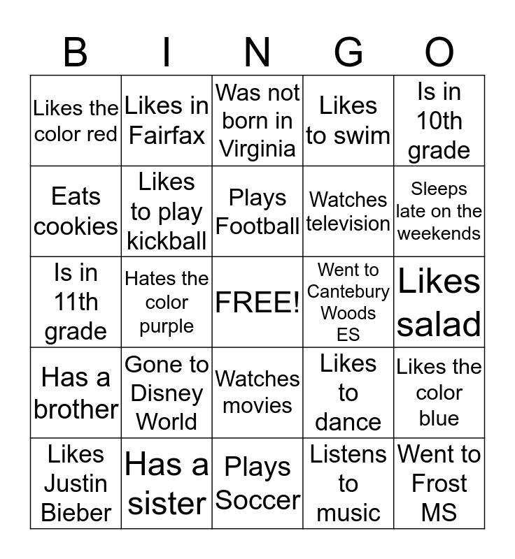 This bingo card has a free space and 25 words: Gone to Disney World, Plays Soccer, Plays Football, Likes Justin Bieber, Is in 10th grade, Likes the color red, Eats cookies, Likes in Fairfax, Went to Cantebury Woods ES, Watches movies, Watches television, Is in 11th grade, Likes to dance, Likes the color blue, Likes to play kickball, Was born in Virginia, Likes salad, Was not born in Virginia, Sleeps late on the weekends, Hates the color purple, Went to Frost MS, Has a sister, Has a brother, Likes to swim and Listens to music.