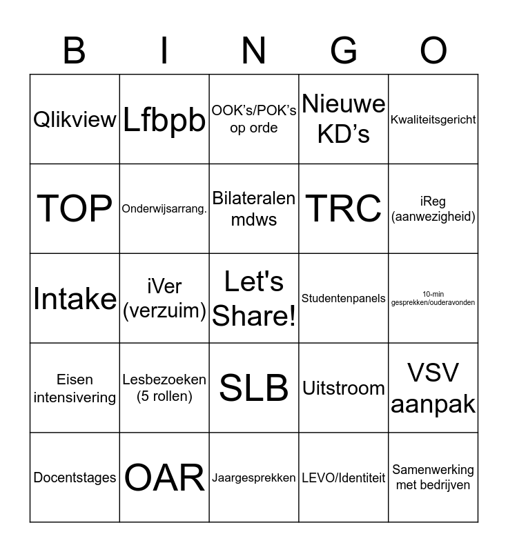 This bingo card has a free space and 25 words: Lesbezoeken (5 rollen), Jaargesprekken, Bilateralen mdws, Docentstages, Kwaliteitsgericht, Qlikview, TOP, Lfbpb, Studentenpanels, SLB, TRC, Intake, Uitstroom, VSV aanpak, Onderwijsarrang., Ouderportaal ELO, 10-min gesprekken/ouderavonden, OOK’s/POK’s op orde, iReg (aanwezigheid), iVer (verzuim), Samenwerking met bedrijven, OAR, Eisen intensivering, Nieuwe KD’s and LEVO/Identiteit.
