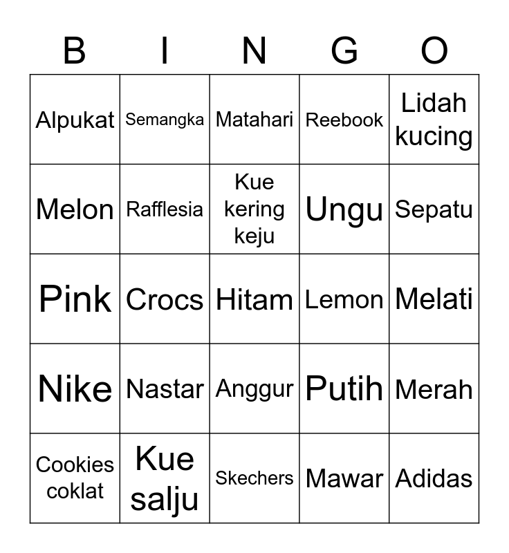 This bingo card has a free space and 24 words: Nastar, Kue salju, Kue kering keju, Cookies coklat, Lidah kucing, Alpukat, Melon, Semangka, Lemon, Anggur, Ungu, Pink, Putih, Merah, Rafflesia, Mawar, Melati, Matahari, Sepatu, Crocs, Adidas, Nike, Reebook and Skechers.