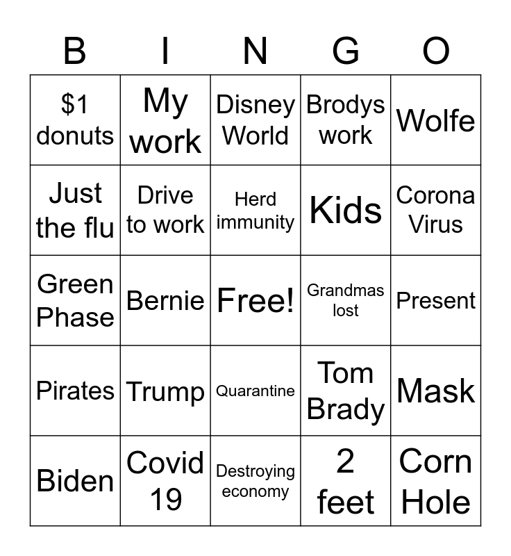 This bingo card has a free space and 24 words: Trump, Covid 19, Herd immunity, Biden, Wolfe, $1 donuts, Just the flu, My work, Grandmas lost, Quarantine, Kids, Green Phase, Tom Brady, Mask, Drive to work, 2 feet, Present, Disney World, Corona Virus, Bernie, Corn Hole, Pirates, Brodys work and Destroying economy.