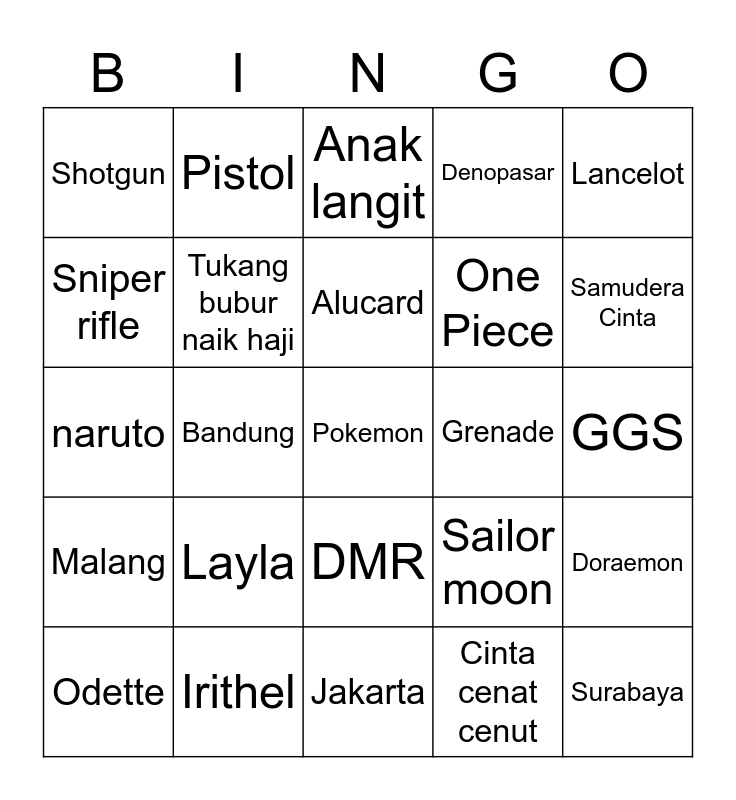 This bingo card has a free space and 24 words: Layla, Irithel, Alucard, Odette, Lancelot, Shotgun, Sniper rifle, Pistol, Grenade, DMR, One Piece, naruto, Sailor moon, Doraemon, Tukang bubur naik haji, Cinta cenat cenut, GGS, Anak langit, Samudera Cinta, Bandung, Surabaya, Malang, Denopasar and Jakarta.