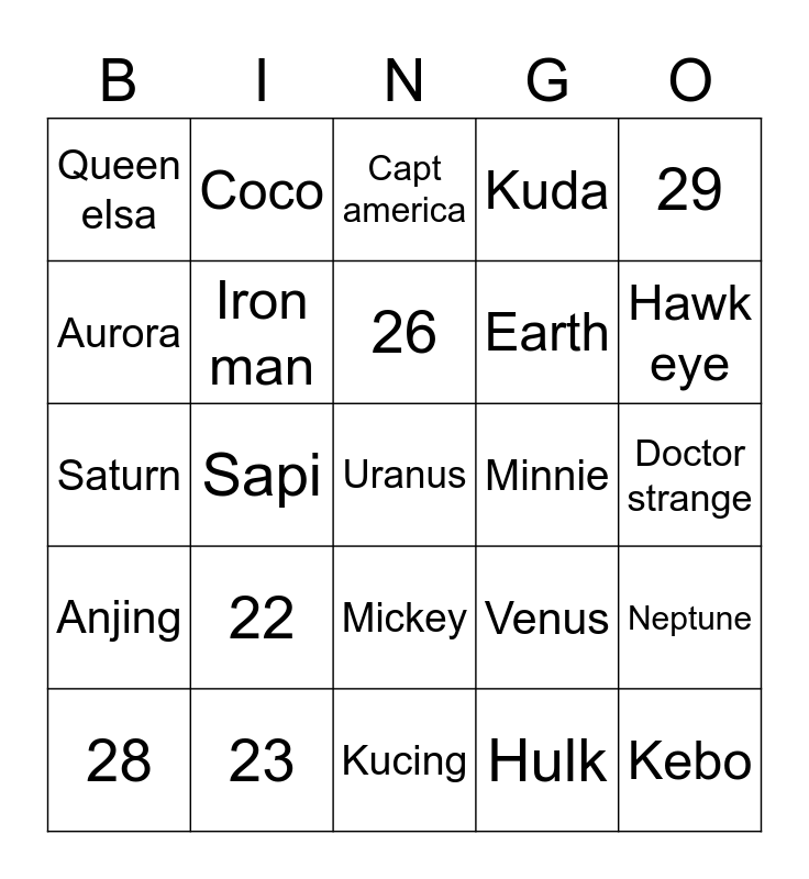 This bingo card has a free space and 24 words: 22, 23, 26, 28, 29, Queen elsa, Aurora, Coco, Minnie, Mickey, Earth, Saturn, Venus, Neptune, Iron man, Hulk, Doctor strange, Capt america, Hawk eye, Sapi, Kebo, Anjing, Kuda and Kucing.
