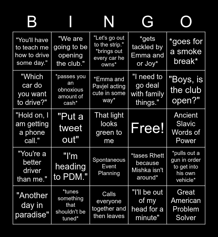This bingo card has a free space and 29 words: "Another day in paradise", Thing go brrrrrrrrrrrrr, "Put a tweet out", *tases Mishka*, "You'll have to teach me how to drive some day.", "Let's go out to the strip." *brings out every car he owns*, *passes you an obnoxious amount of cash*, "I'm heading to PDM.", Free!, *tunes something that shouldn't be tuned*, Ancient Slavic Words of Power, Great American Problem Solver, Calls everyone together and then leaves, "I'll be out of my head for a minute", "Boys, is the club open?", "Pavjel is on net", Spontaneous Event Planning, "You're a better driver than me.", *goes for a smoke break*, "Hold on, I am getting a phone call.", *tases Rhett because Mishka isn't around*, *has Emma drive his vehicles*, "I need to go deal with family things.", "Which car do you want to drive?", *gets tackled by Emma and or Joy*, "We are going to be opening the club.", *pulls out a gun in order to get into his own vehicle*, *Emma and Pavjel acting cute in some way* and *places a marker on GPS to find his way around the city*.