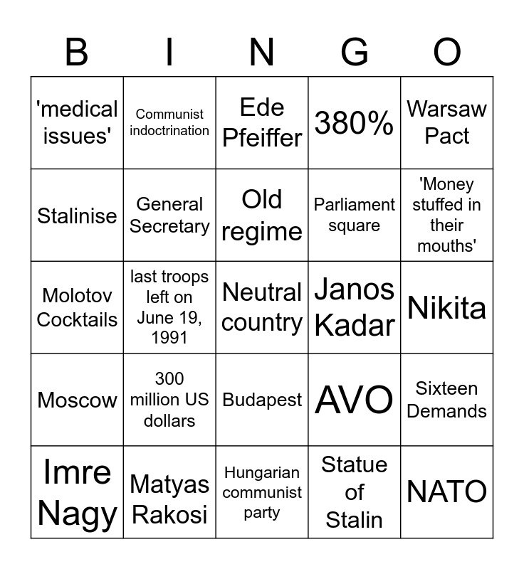 This bingo card has 25 words: 300 million US dollars, Hungarian communist party, Old regime, Imre Nagy, Warsaw Pact, 'medical issues', Stalinise, Communist indoctrination, Janos Kadar, Budapest, Parliament square, Molotov Cocktails, AVO, Sixteen Demands, General Secretary, NATO, Nikita, Ede Pfeiffer, 'Money stuffed in their mouths', last troops left on June 19, 1991, Neutral country, Matyas Rakosi, Moscow, 380% and Statue of Stalin.