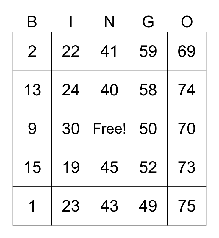 This bingo card has a free space and 24 words: 1, 19, 40, 49, 69, 2, 22, 41, 50, 70, 9, 24, 52, 73, 13, 23, 43, 59, 74, 15, 30, 45, 58 and 75.