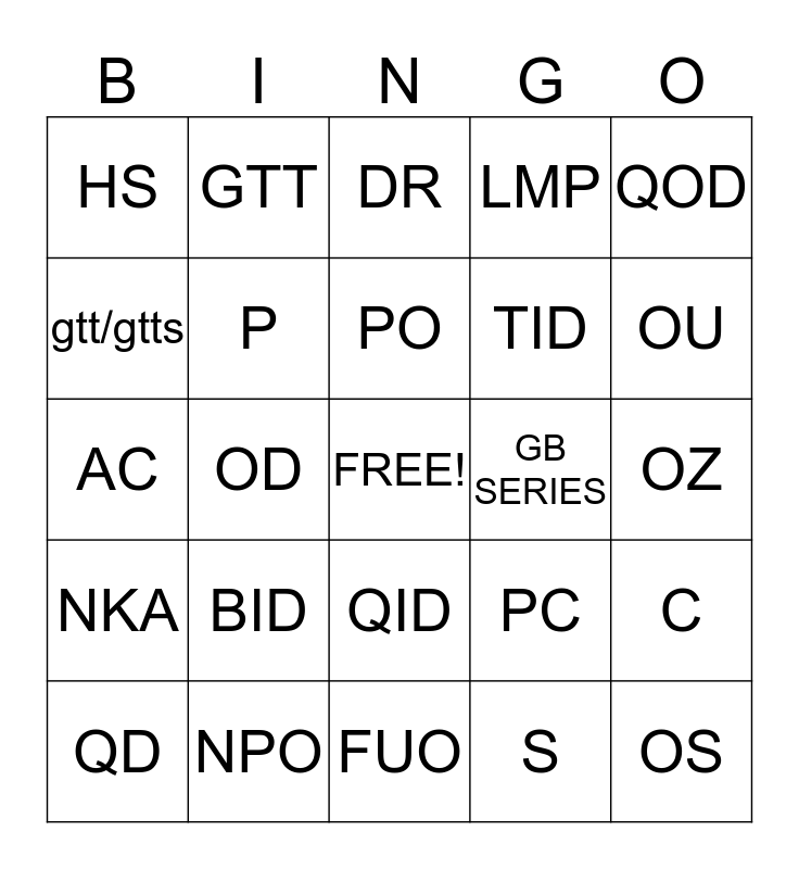This bingo card has a free space and 24 words: BID, NPO, PO, QD, QOD, HS, gtt/gtts, GTT, GB SERIES, QID, TID, AC, PC, C, P, S, OZ, DR, OU, OD, OS, NKA, LMP and FUO.