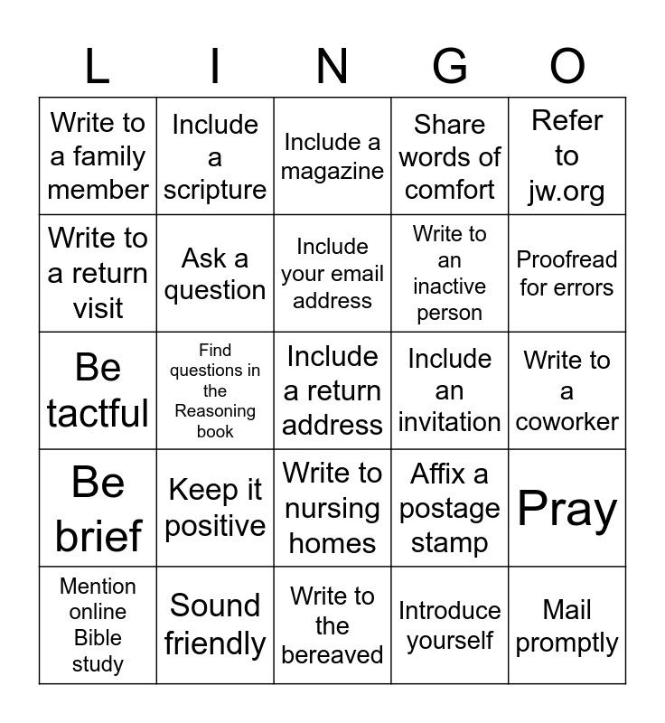This bingo card has 34 words: Mail promptly, Introduce yourself, State why you are writing, Join a letter writing group, Be brief, Ask a question, Refer to jw.org, Mention online Bible study, Include a scripture, Add a QR code, Include your email address, Include a magazine, Include a tract, Include a contact card, Include an invitation, Proofread for errors, Sound friendly, Be tactful, Keep it positive, Affix a postage stamp, Write to nursing homes, Write to emergency personel, Write to a family member, Write to a coworker, Write to the bereaved, Include a return address, Share words of comfort, Be loving, Write to an inactive person, Write to a return visit, Write to newly weds, Find questions in the Reasoning book, Pray and Keep it neat and tidy.
