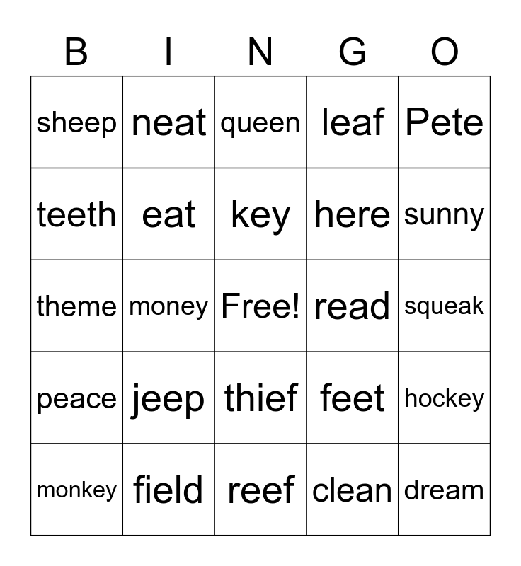 This bingo card has a free space and 24 words: jeep, field, key, monkey, Pete, sheep, teeth, neat, read, thief, here, theme, feet, hockey, eat, clean, squeak, queen, sunny, money, dream, peace, leaf and reef.