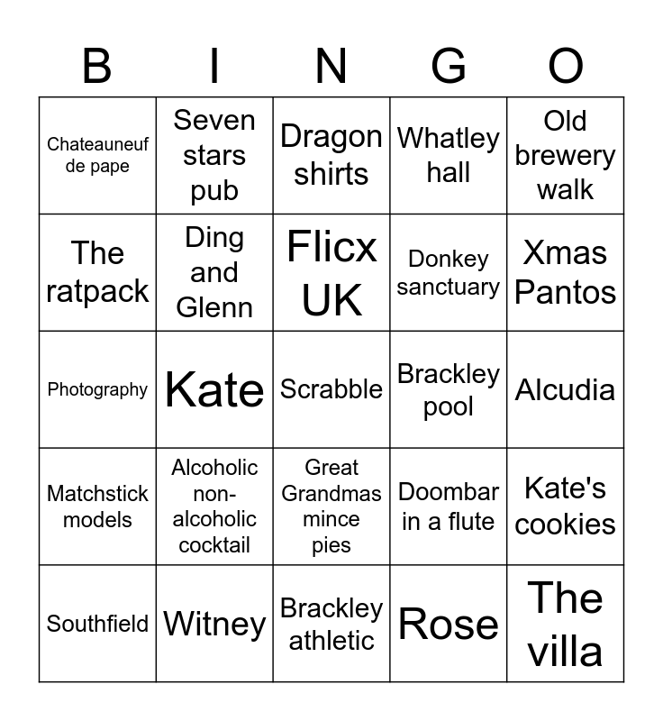 This bingo card has 73 words: Free!, Bbq, Chateauneuf de pape, Family fun day, Newmarket, King prawn balti, Matchstick models, Chilli pepper, Doombar in a flute, Dry white wine, The villa, Cruising, Ding and Glenn, Alcudia, Sedgley, Dudley, Seven stars pub, Brackley athletic, The ratpack, Tesco, Brackley pool, Flicx UK, Whatley hall, Old brewery walk, Castle mount, Southfield, Magdalen college school, Aston, Bournemouth, Durham, Brighton, Witney, Aylesbury, Flintoff Academy, BMW, Kate, Hannah, Boggle, Nomination whist, Scrabble, Prosecco, Rose, Alcoholic non-alcoholic cocktail, Singapore sling, Celebration, Merriscourt, Donkey sanctuary, Dragon shirts, Christmas corona, Ned, Photography, Drone, Sri Lanka, Palma, New Zealand, Sutton coldfield, Britannic, Cheadle Hulme, Great Grandmas mince pies, Grandma and Grandad, Nana & Pop, Uncle David, Colin and Linda, Harrogate Lot, Xmas Pantos, Polly, The Crown, Sequence, Brackley CC, Kate's cookies, Hannah Brownies, Scoring, Not another Skype quiz and Taxi back at 2am to Castle Mount.