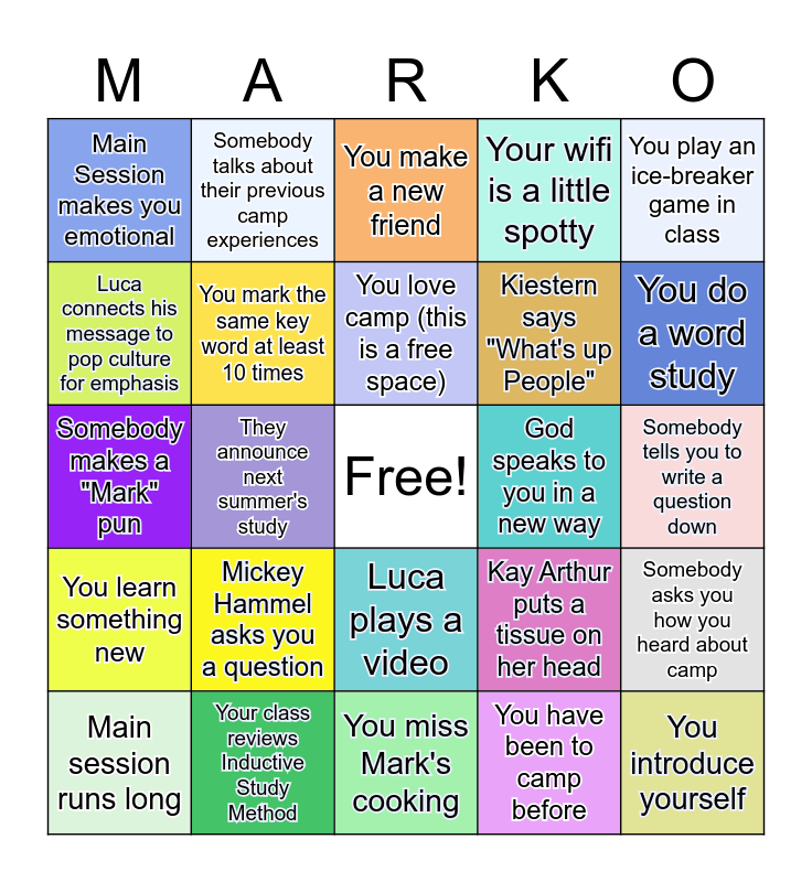 This bingo card has a free space and 34 words: This is your first camp, You have been to camp before, Technology malfunctions, You go to Hype Time, You learn something new, You mark the same key word at least 10 times, You play an ice-breaker game in class, Main session runs long, Somebody talks about their previous camp experiences, You stay in your pj or sweat pants all day, You love camp (this is a free space), You make a new friend, A family member interrupts your studies, You get a snack, God speaks to you in a new way, You do a word study, Your class reviews Inductive Study Method, Somebody makes a "Mark" pun, Mickey Hammel asks you a question, Kay Arthur puts a tissue on her head, Luca plays a video, Carlotta makes an announcement, Main Session makes you emotional, Somebody tells you to write a question down, You miss Mark's cooking, You introduce yourself, Your wifi is a little spotty, You wear your camp T-shirt, Kiestern says "What's up People", Luca connects his message to pop culture for emphasis, You mark a key word in green, They announce next summer's study, Somebody asks you how you heard about camp and Somebody accidentally mutes him- or herself.