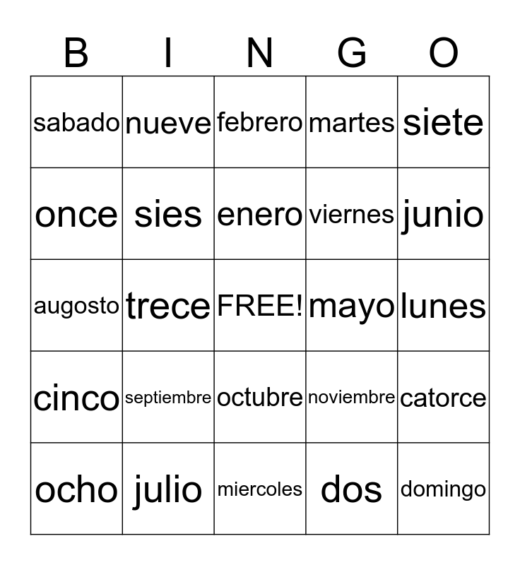 This bingo card has a free space and 34 words: uno, dos, tres, cuartro, cinco, sies, siete, ocho, nueve, diez, enero, febrero, marzo, abril, mayo, junio, julio, augosto, septiembre, noviembre, octubre, deciembre, sabado, lunes, miercoles, domingo, martes, jueves, viernes, once, dose, trece, catorce and quience.