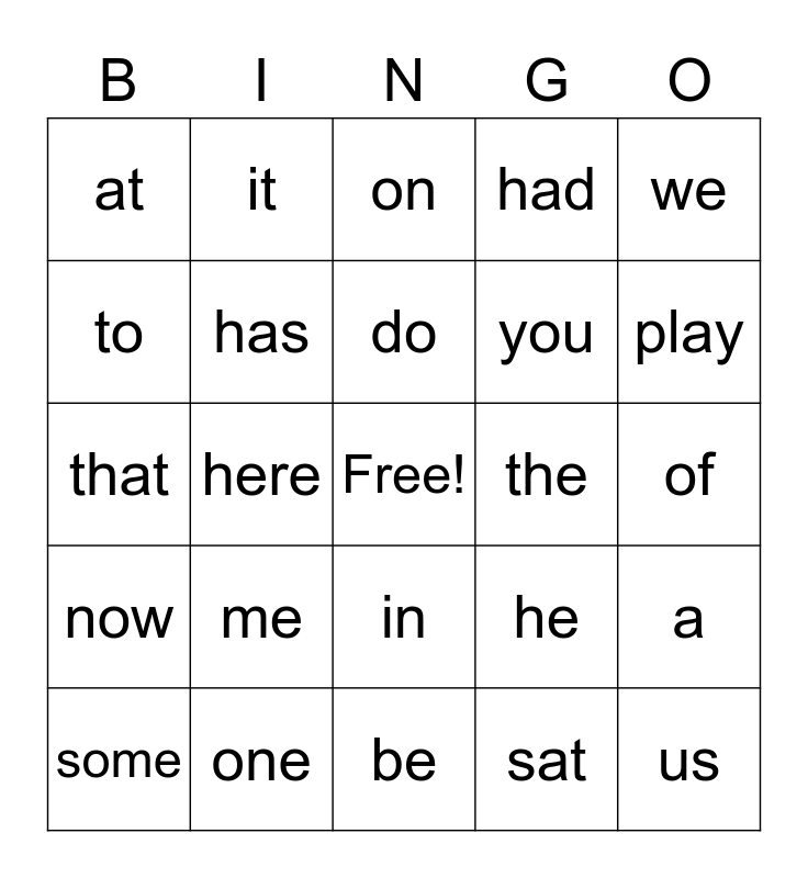 This bingo card has a free space and 24 words: me, one, do, some, we, at, to, it, the, in, you, that, he, a, has, sat, of, on, play, here, us, now, had and be.