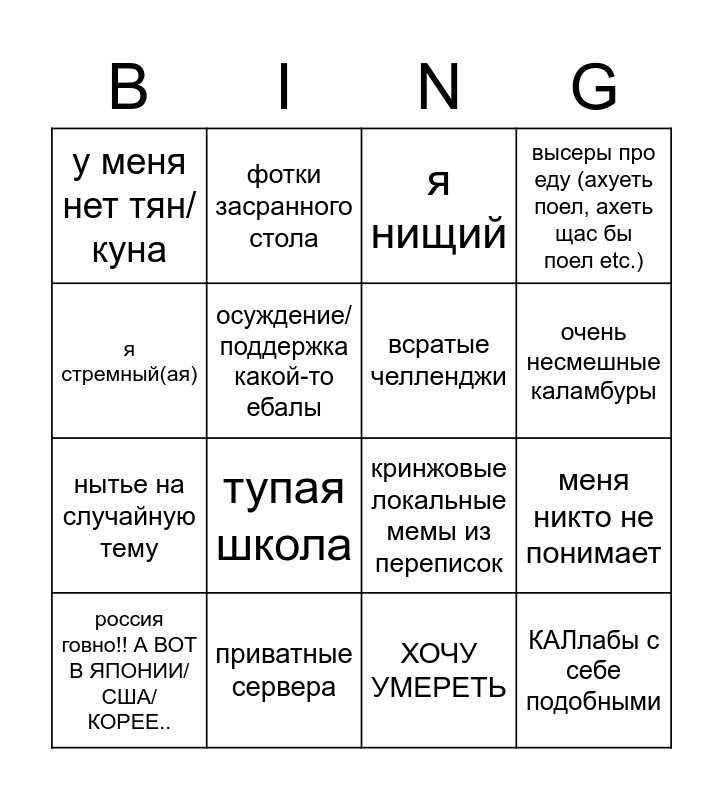This bingo card has 16 words: приватные сервера, меня никто не понимает, я нищий, у меня нет тян/куна, нытье на случайную тему, фотки засранного стола, кринжовые локальные мемы из переписок, ХОЧУ УМЕРЕТЬ, я стремный(ая), осуждение/поддержка какой-то ебалы, россия говно!! А ВОТ В ЯПОНИИ/США/КОРЕЕ.., высеры про еду (ахуеть поел, ахеть щас бы поел etc.), тупая школа, очень несмешные каламбуры, всратые челленджи and КАЛлабы с себе подобными.